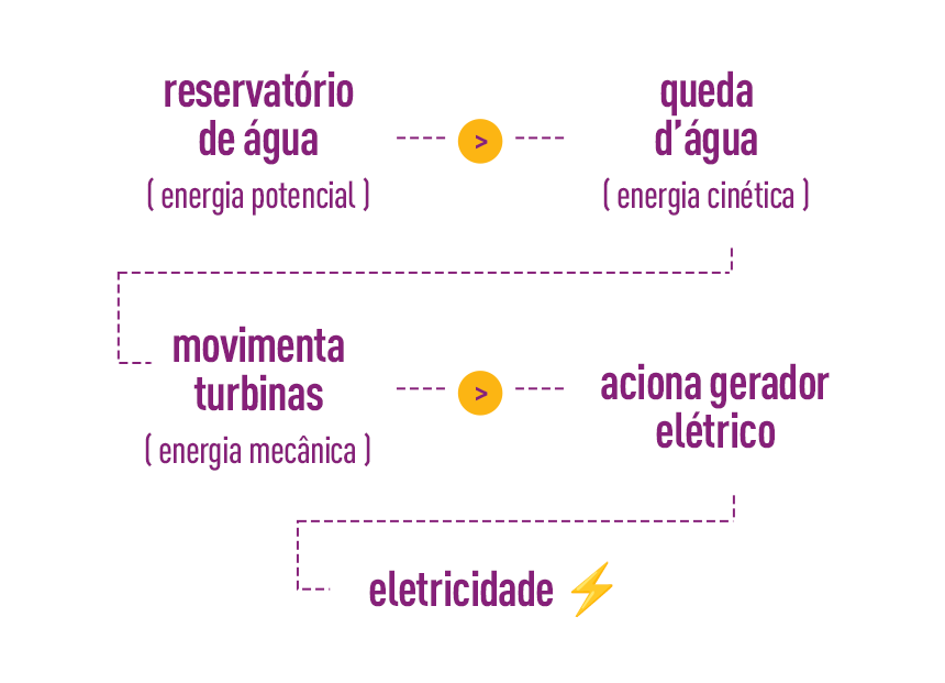 Para entender o processo de transformação da força da água em eletricidade é preciso retomar alguns conceitos das aulas de física.