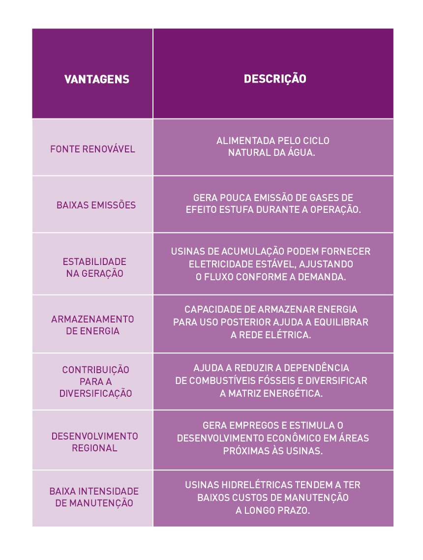 Como já dito, a energia hidrelétrica é alimentada por um recurso natural limpo, abundante e com um ciclo de renovação: a água.