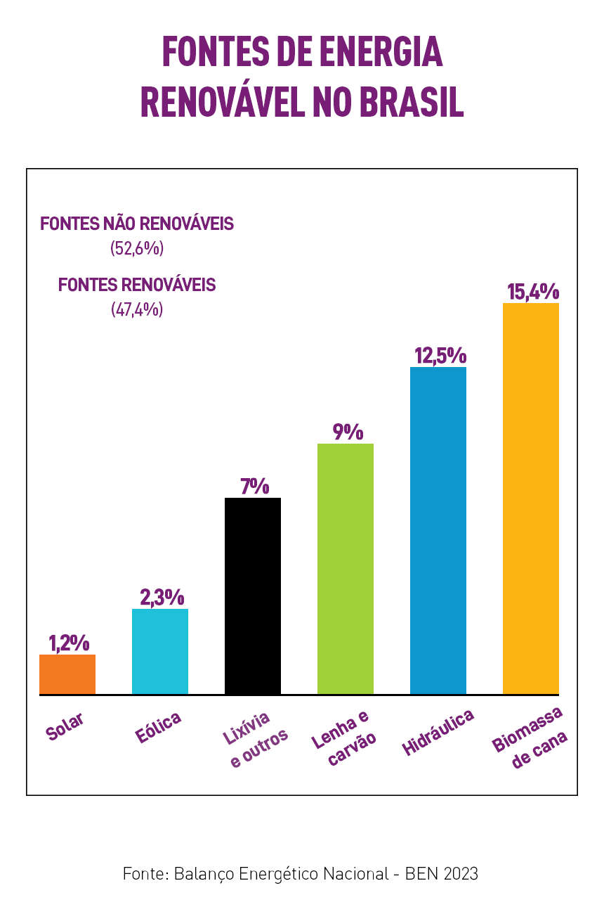 A matriz energética do país vai além da eletricidade, incluindo também os diferentes tipos de combustíveis. Quando se considera a matriz energética total do país, a participação de renováveis é de 47,4%.